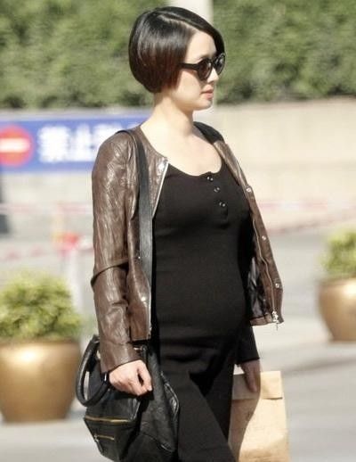 马伊琍一身黑色连衣裙,搭配棕色机车皮衣,一款黑色单肩包,时尚帅气的辣妈LOOK。