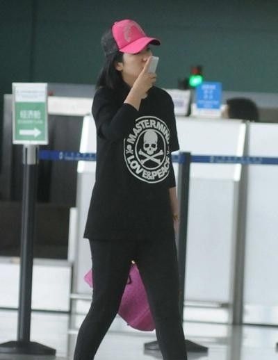 黄奕一身黑色T恤加黑色长袖打底衫,形成两件套的搭配形式,富有创意,更有层次感,黑色紧身裤十分显瘦,胸前白色字母与骷髅骨组合而成的一个图案是整体搭配的中心点,非常时髦个性。
