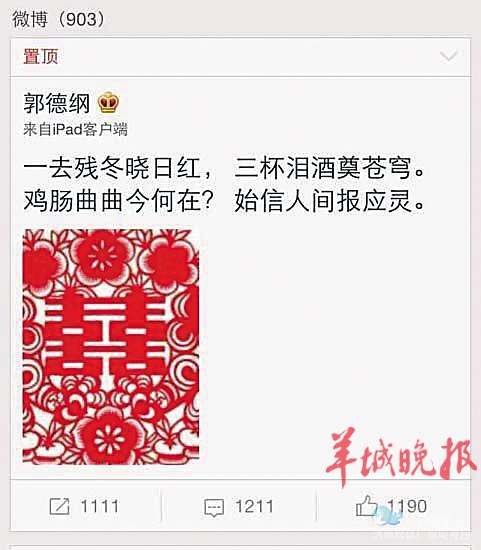 袁弘在微博转发了“油炸纲”照片 11月20日下午,郭德纲在微博贴出一首打油诗,结果掀起轩然大波。这首诗是这么写的:“一去残冬晓日红,三杯泪酒奠苍穹。鸡肠曲曲今何在?始信人间报应灵。”而在19日上午,北京电视台台长王晓东因肝癌去世。由于郭德纲曾与北京台交恶,诗中字句又暗合王晓东的名字,许多人质疑郭德纲是在影射这位已故台长。北京市政府新闻办公室主任王惠更是发微博点名谴责郭德纲 :“人民不需要没公德的艺人!” 微博含沙射影写诗称“报应灵”还贴喜字 11月19日上午,北京广播电视台台长王晓东因肝癌病逝,年仅51岁。随后郭德纲 发出一条微博:“一去残冬晓日红,三杯泪酒奠苍穹。鸡肠曲曲今何在?始信人间报应灵。” 许多圈内人都知道,郭德纲与北京电视台有过一段“封杀”恩怨,郭德纲徒弟还曾经打过北京台的记者。这首诗中有“冬(东)”、“晓”二字,藏头的“一”、“三”也暗喻“王”字,不少人相信这首诗是在影射王晓东。 郭德纲 不仅配以一张“红双喜”图片,还将该条微博置顶。该微博引来质疑声不断,或许是见到外界反应激烈,这条微博后来被删除。 经纪人说“不知道谁死了”有媒体联系了郭德纲的经纪人王海,他表示郭德纲 正在横店拍戏,并辩解道:“我们在这边拍戏都快与世隔绝了,并不知道谁死了的事情。我们和王晓东没什么可较劲的,只是早已不联系不沟通,谁也不找谁了。这条微博应该和他没什么关系,但外界太敏感、联想力太丰富了!” 王海并没有对打油诗中的“巧合”做解释,也没有说明后来为何要删掉这条“没关系”的微博。 郭德纲小舅子王俣钦则表示不清楚此事的来龙去脉,但他认为郭德纲 是一个“挺好、不记仇的人”。 ![]()